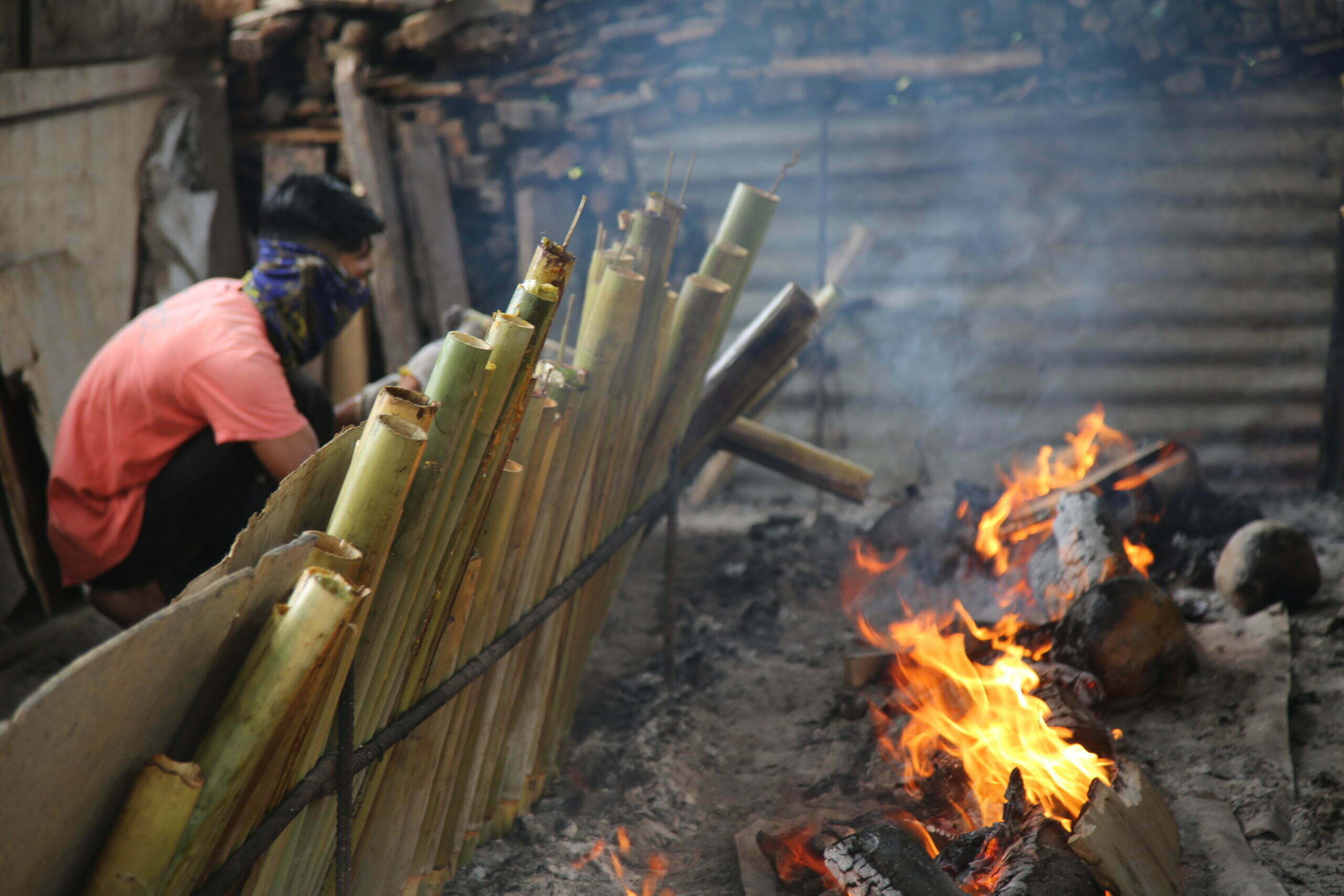 Untuk prosesnya, awalnya lemang digulung terlebih dahulu pada selembar daun pisang. Kemudian, lemang dimasak di dalam seruas bambu lalu dibakar di atas bara api yang sedang tidak boleh terlalu besar dan tidak boleh terlalu kecil apinya selama 8 jam.