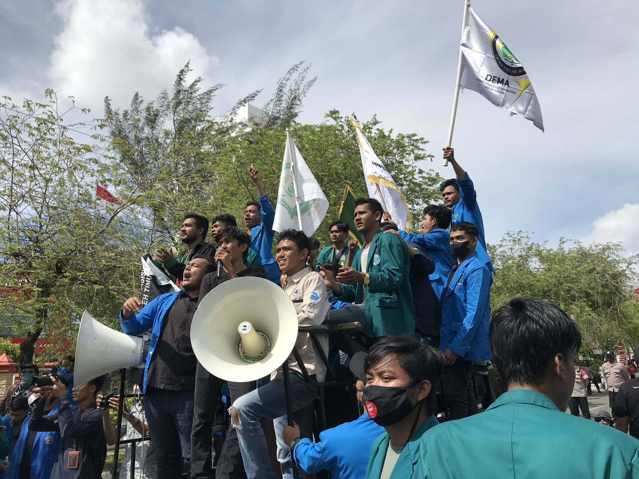 Dalam aksi tersebut, tampak ribuan para mahasiswa yang mengenakan jaket almamater berhasil masuk ke perkarangan halaman gedung DPRA.